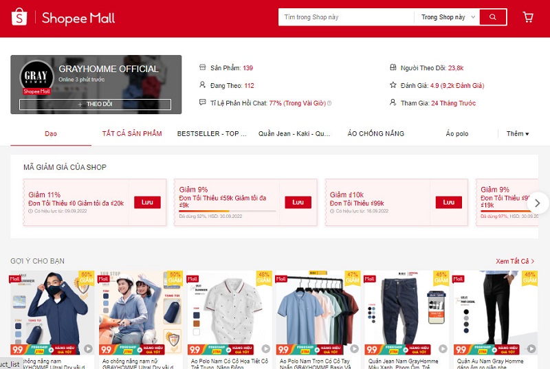 Grayhomme Official là một shop không chỉ bán áo chống nắng, áo khoác nam mà bạn còn có thể tìm các sản phẩm quần áo ở trong shop này. Shop thuộc Shopee Mall nên các sản phẩm của shop đều vô cùng uy tín và có giá thành phải chăng. Các thông tin cơ bản về lượt đánh giá và người theo dõi của shop đều cao khi có tới k người theo dõi và 4.9 điểm đánh giá.