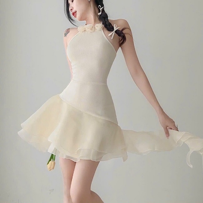 - Đầm body thun gân cổ yếm đính hoa phối bèo