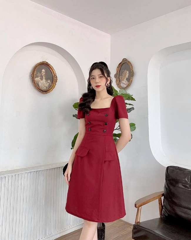 Váy cổ vuông tay bồng với đính khuy là một kiểu váy thanh lịch và dễ thương, phù hợp cho những ngày đầu xuân tươi mới. Thiết kế cổ vuông tạo nên vẻ dễ thương, trong khi tay bồng và đính khuy thêm phần điệu đà và nổi bật. Có thể nói, đây là sự kết hợp hài hòa giữa sự tinh tế và sự trẻ trung, làm nổi bật vẻ đẹp tự tin của bạn trong mọi bức hình và dịp tiệc Tết.