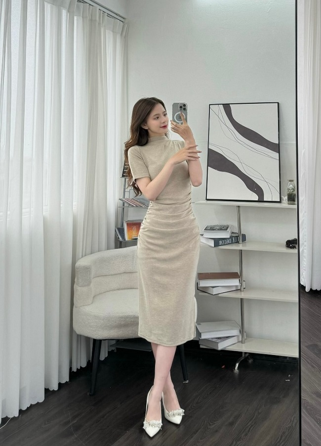 Váy len màu be nhún eo dáng dài