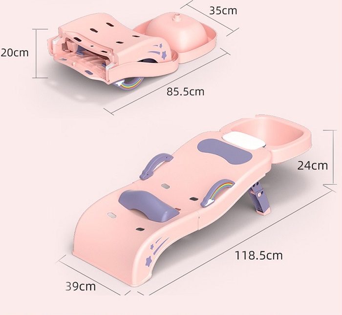 Chiếc ghế này có thiết kế vừa vặn với chiều cao và cân nặng của trẻ, giúp người lớn gội đầu cho trẻ dễ dàng hơn. Ghế có 2 màu xanh và hồng để mẹ tùy ý lựa chọn. Ghế cũng có thể gấp gọn gàng lại và để vào góc phòng khi không sử dụng đến.