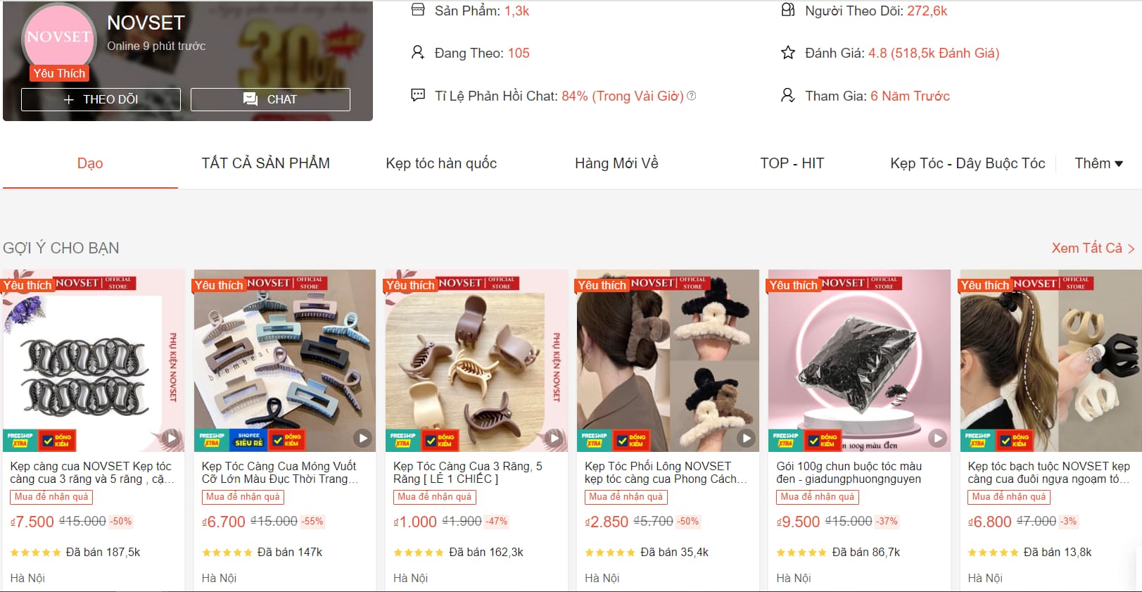 Shop bán kẹp tóc càng cua Novset là shop uy tín trên Shopee mà bạn có thể tin tưởng để mua các phụ kiện làm đẹp cho tóc, đặc biệt là kẹp tóc càng cua. Tại đây có rất nhiều mẫu kẹp đa dạng, bắt trend và cute, giá thành siêu rẻ chỉ từ 1K.