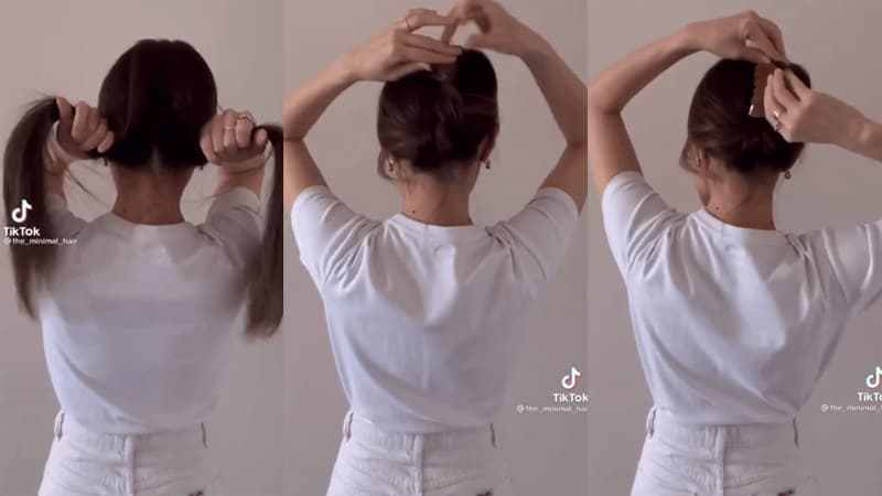 Bạn túm cả mái tóc rồi vặn cụp tóc vào bên trong, kẹp tóc ở phần ngọn tóc cuối cùng, khi đó phần đuôi tóc phải cụp vào trong, bạn giữ nếp tóc quấn sau gáy rồi kẹp lại.