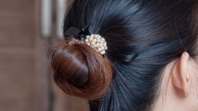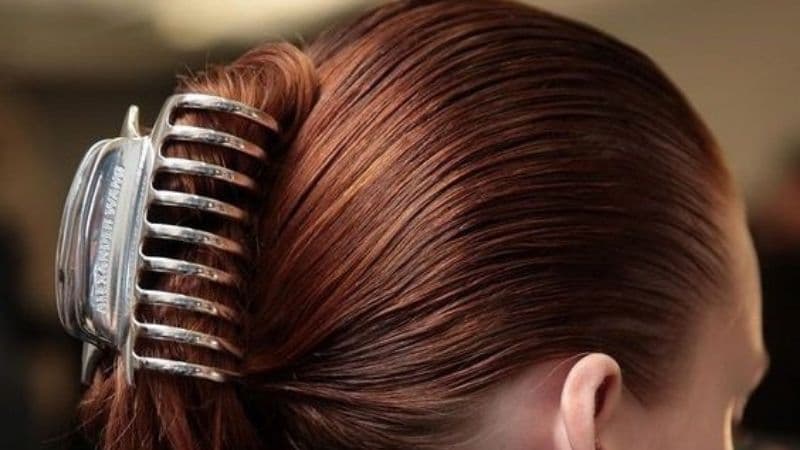Dùng dây chun buộc tóc thấp dưới gáy, gập phần đuôi tóc lại và cố định bằng kẹp càng cua kiểu dài.