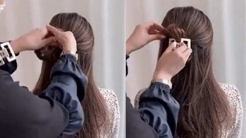 Buộc tóc như bình thường, sau đó chia làm đôi, lộn ngược lại đuôi tóc vào trong và kẹp càng cua để che đi phần buộc là có ngay kiểu tóc sang xịn mịn rồi.
