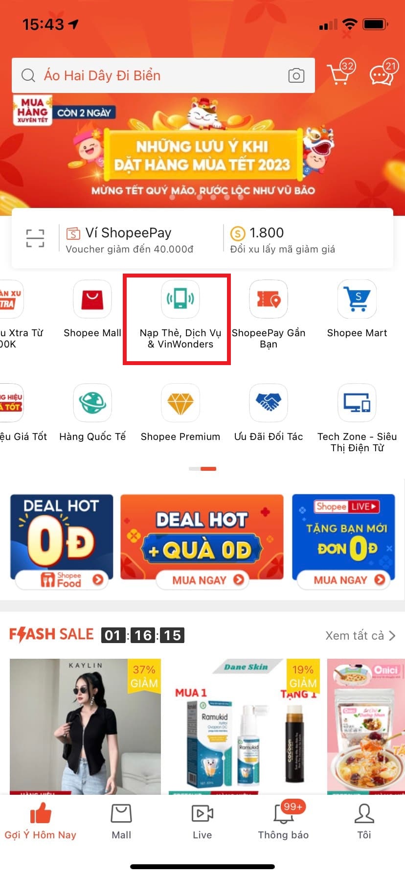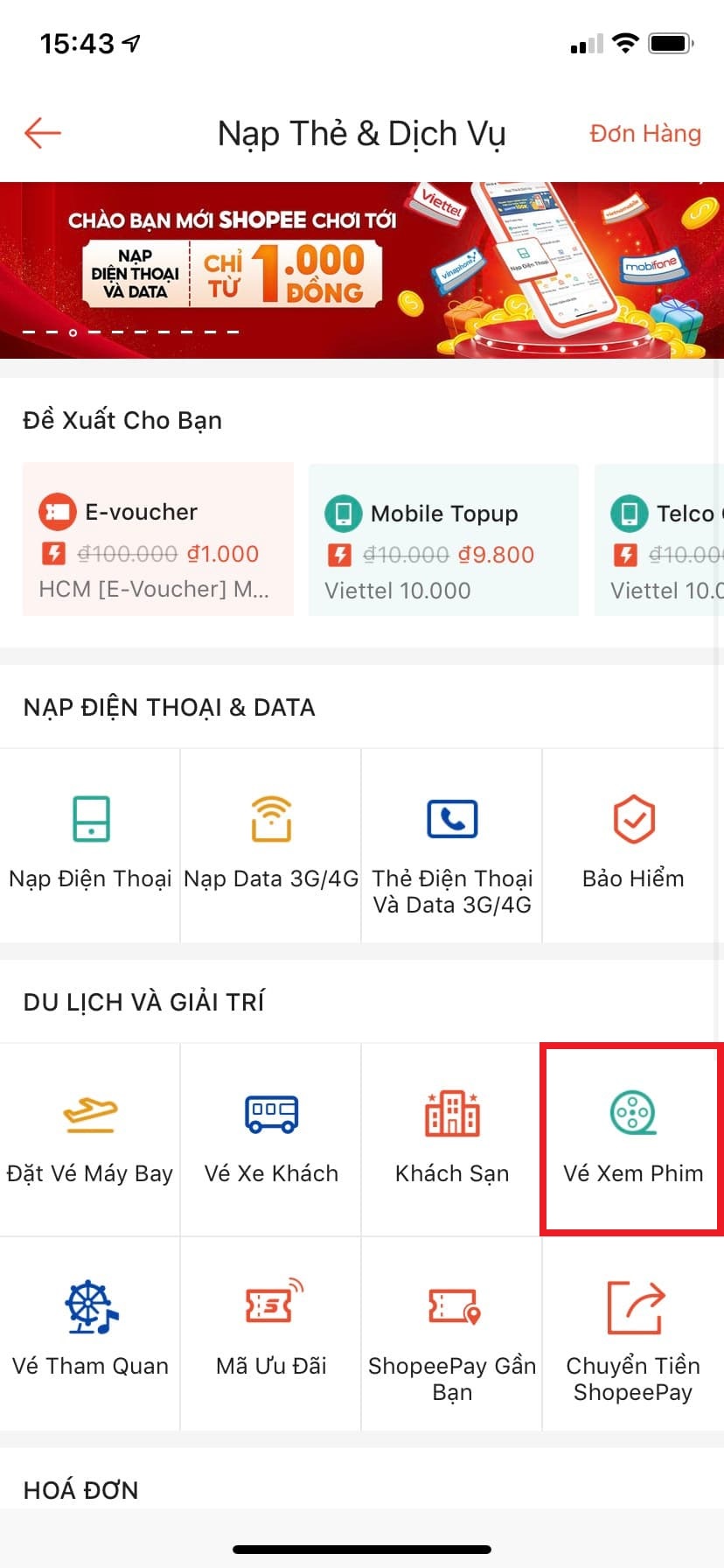 Bước 2: Tại trang chủ Shopee, bạn chọn ngay mục Nạp thẻ & Dịch vụ.