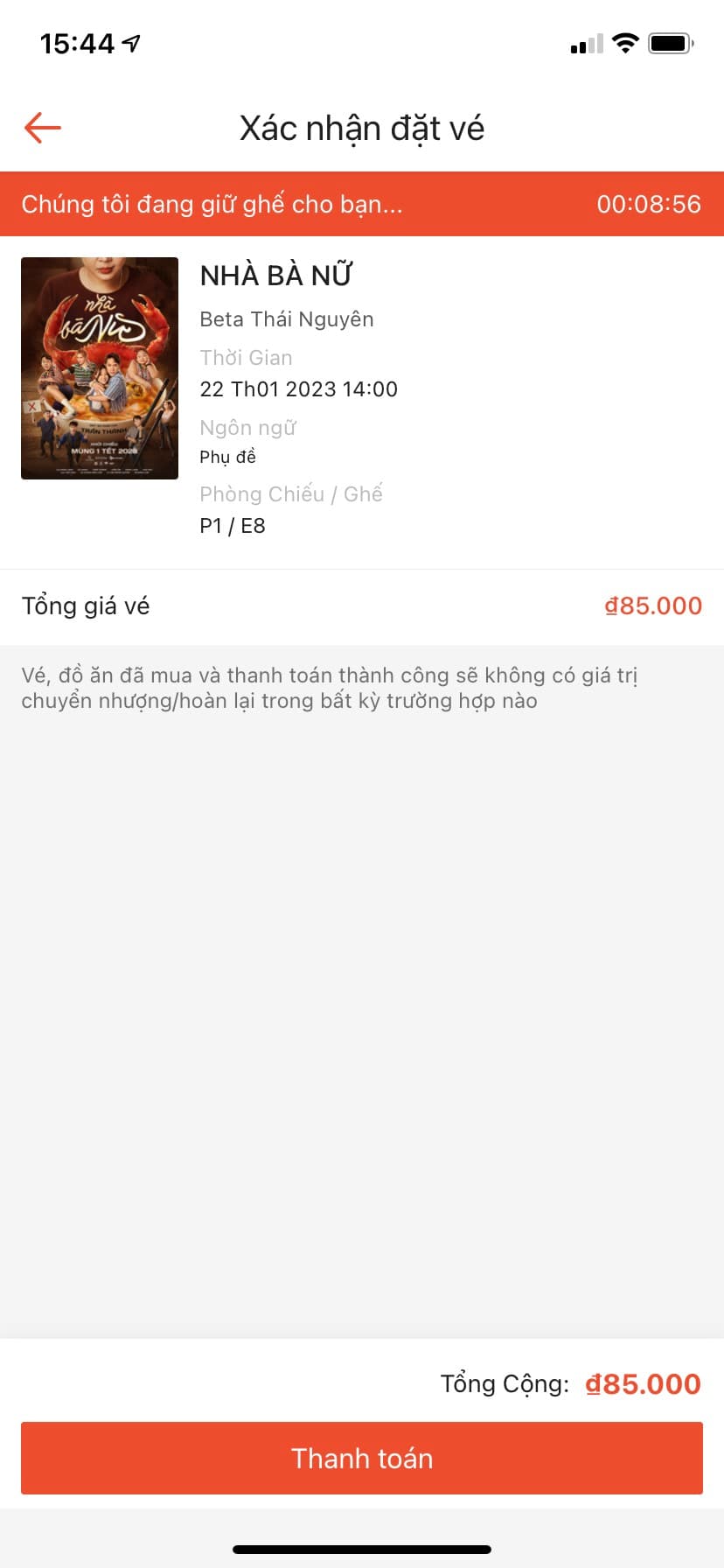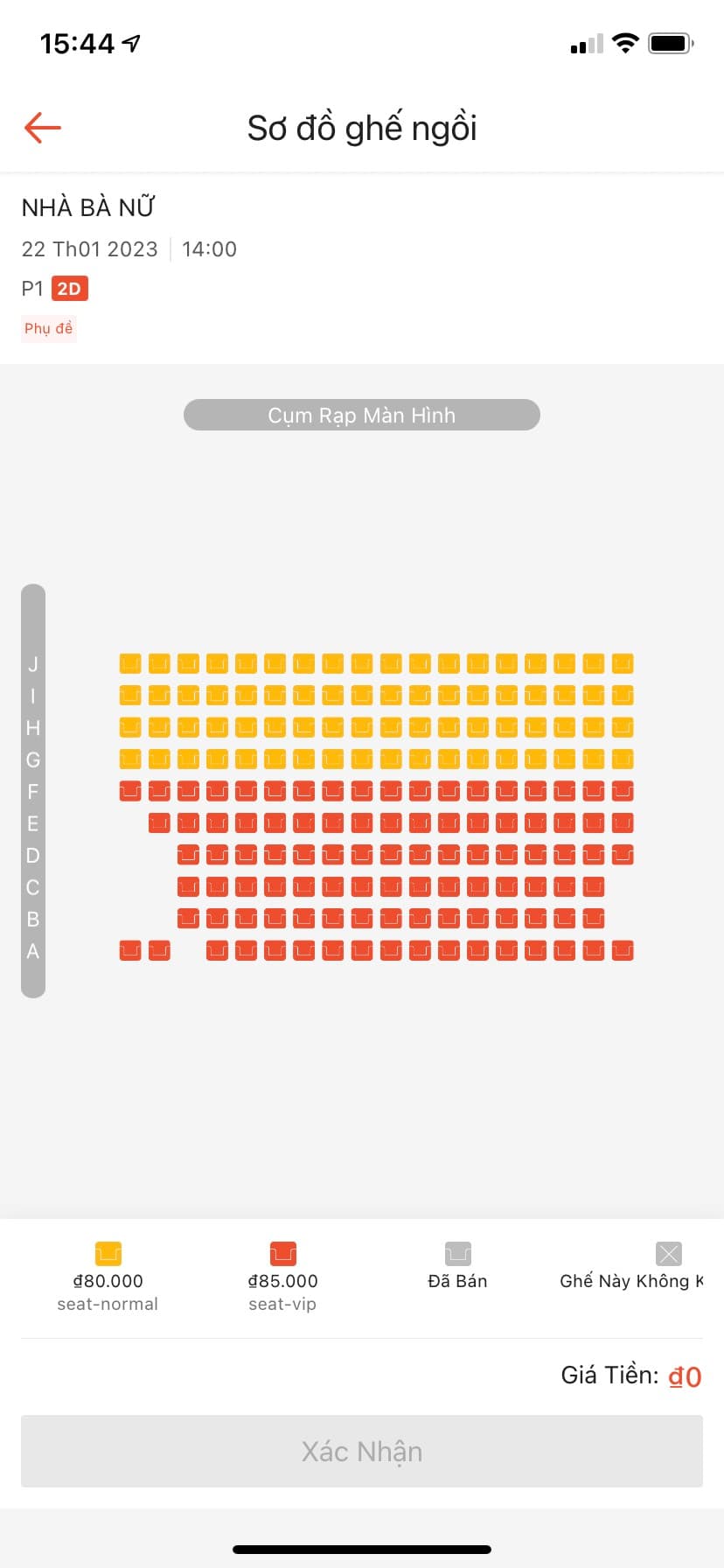 Bước 3: Tại đây, bạn sẽ mục Vé xem phim rồi chọn rạp, chọn phim và chọn khung giờ bạn muốn xem. Tiếp đó, chọn vị trí ngồi mà bạn muốn => Xác nhận.