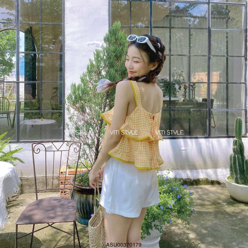- Áo kiểu nữ đi biển croptop 2 dây 2 tầng caro