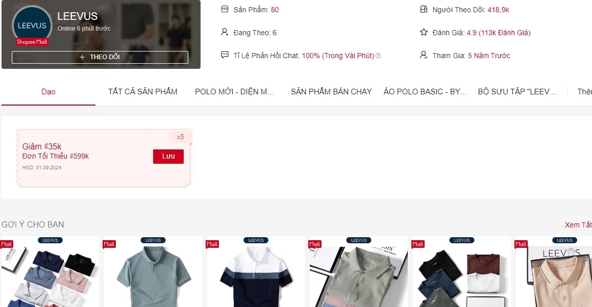 Shop áo thun nam LEEVUS đã thu hút và giữ chân được nhiều khách hàng nhờ chất lượng sản phẩm tốt cũng như giá thành hợp lý. 418,8k người theo dõi trên 113k đánh giá trên gian hàng chính hãng Shopee là minh chứng cho sự tin tưởng và ủng hộ của đông đảo người dùng.