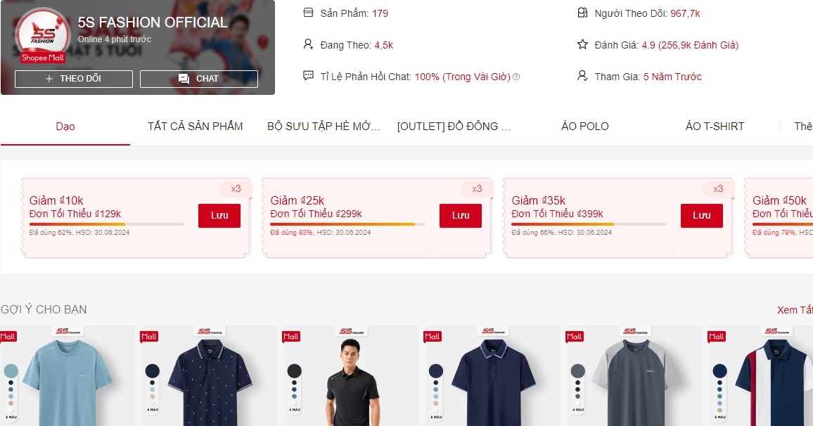 Sẽ thật thiếu sót nếu khi tìm mua áo thun nam mùa hè không nhắc đến 5S Fashion. Đây là một thương hiệu thời trang nổi tiếng của Việt Nam. Những mẫu áo thun nam cho mùa hè 5S Fashion với đặc trưng mẫu mã trẻ trung, đa dạng, mức giá bình dân vải khá đẹp, có co dãn thấm hút mồ hôi tốt...
