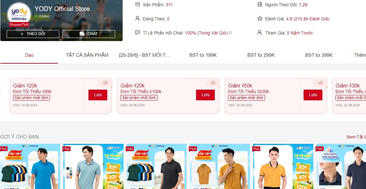 Trên gian hàng YODY Official Store Shopee có rất nhiều mẫu áo thun nam mùa hè với đủ size, nhiều mà cho người mua chọn lựa. Với 1,2 triệu follow và gân 220k đánh giá tích cực từ người mua thì đây là địa chỉ tin cậy dành cho bạn.