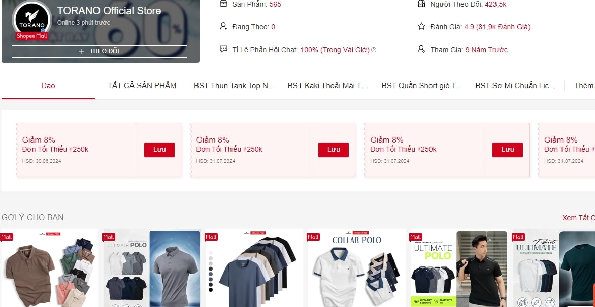 TORANO Official Store là điểm mua sắm lý tưởng cho các quý ông tìm kiếm sự hoàn hảo trong những thiết kế áo thun nam mùa hè. Chất lượng sản phẩm của Shop được khảng định qua 81,9k lượt đánh giá và 423,5k Follow.