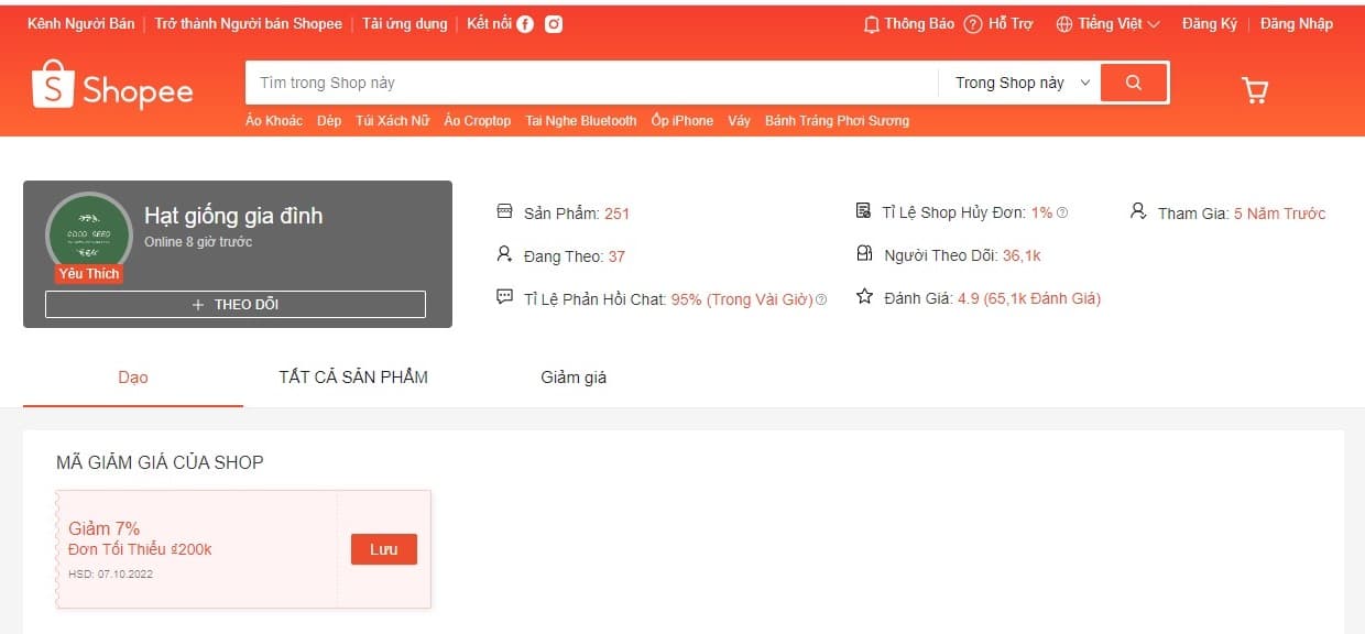 Good seed – Hạt giống gia đình là shop sở hữu 36,1 k lượt người theo dõi, 4,9 ( 65,1 k đánh giá) và tỉ lệ phản hồi chát của shop rất nhanh chỉ trong vài giờ. Shop có 251 sản phẩm thiên về hoa cảnh.