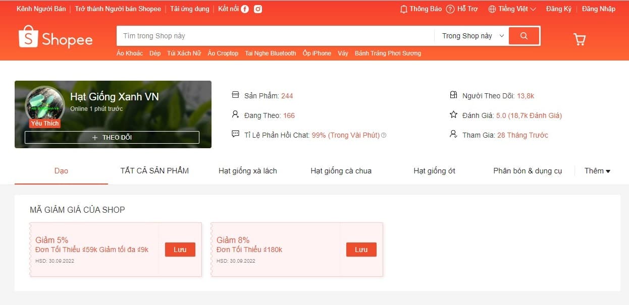 Hạt giống xanh Việt Nam shop sở hữu 13,8k lượt theo dõi, 5.0 (18,7k đánh giá), tỉ lệ phản hồi chát trong vài phút. Shop tham gia thị trường thương mại điện tử Shopee 28 tháng trước.