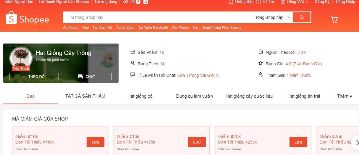 Shop hạt giống cây trồng sở hữu 7,4 k lượng theo dõi, 4.8 (7,4 k đánh giá) và tỉ lệ phản hồi chát 88% trong vài giờ.