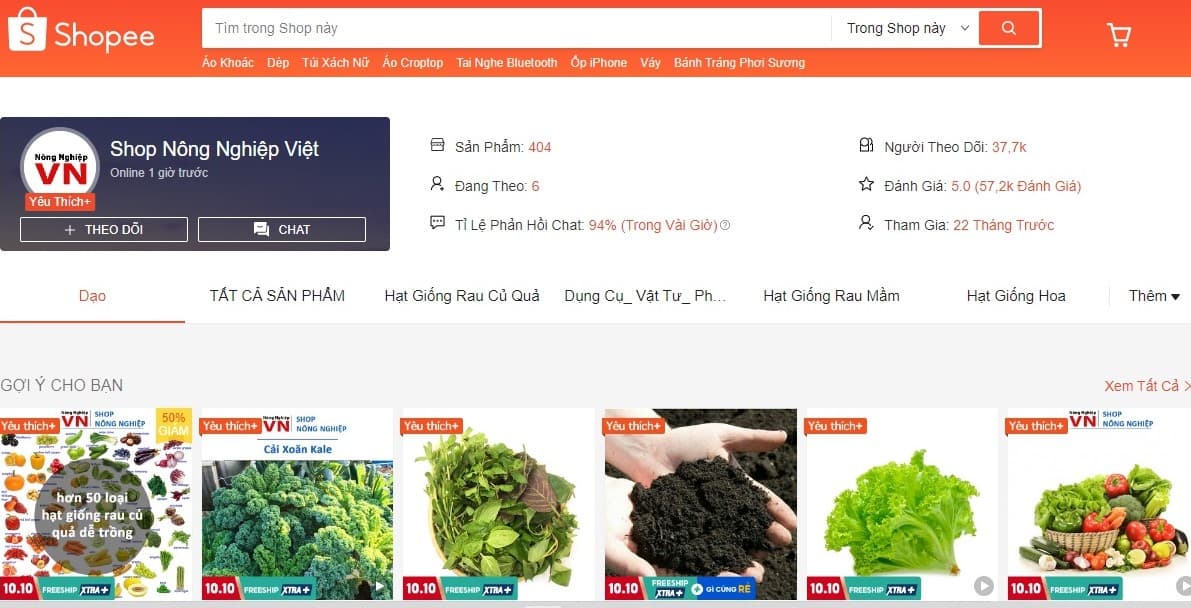Shop Nông nghiệp Việt Nam sở hữu Người Theo Dõi: 37,7k; Đánh Giá: 5.0 (57,2k Đánh Giá)