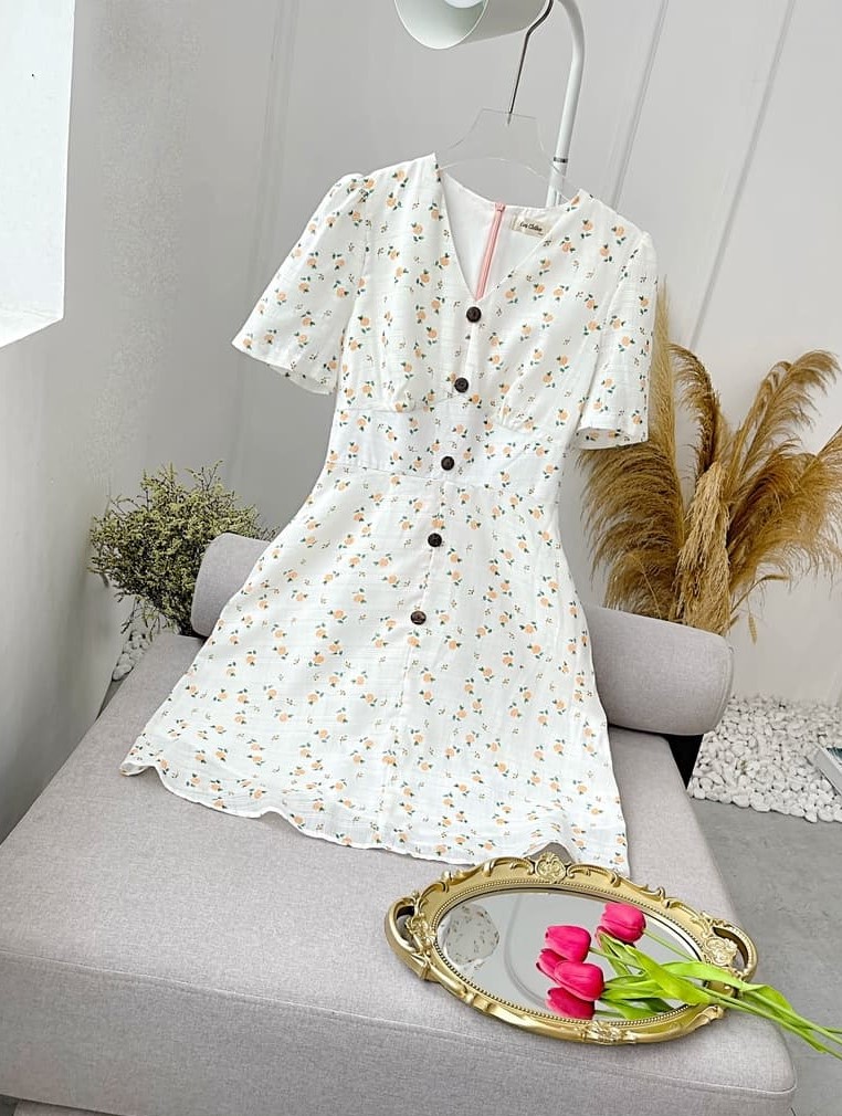Váy hoa nhí cổ V ngắn tay Eva Lover được thiết kế rất trẻ trung và nữ tính, phần phía trước là cúc nhỏ màu nâu đen tạo điểm nhấn. Họa tiết có 2 kiểu khác nhau là hoa hồng và hoa vàng cam, thế nên tùy theo gu mà các bạn chọn nhé. Những bạn nào cao khoảng 1m60 thì váy sẽ trên gối một chút.