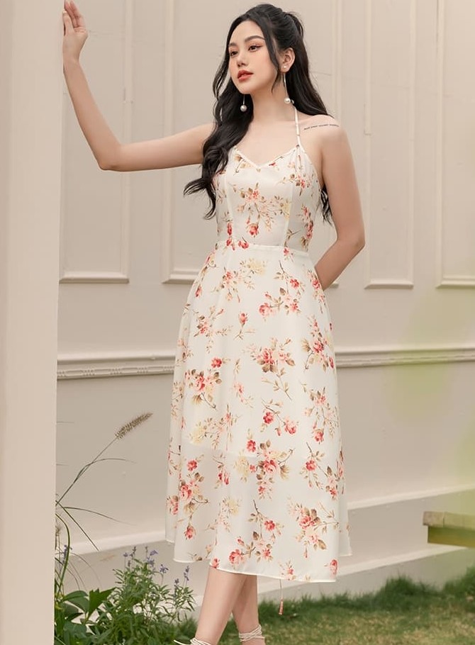 Váy hoa nhí 2 dây dáng dài thích hợp đi biển, đi dạo phố và đi hẹn hò. Thiết kế 2 dây buộc sau cổ giúp bạn khéo léo khoe được đôi vai thon thả, quyến rũ. Phần thân trước của váy may ôm gọn vào người, phần sau có dây đan trang trí. Khi mặc mẫu này, bạn sẽ cảm nhận cơ thể gọn hơn, hack dáng hơn nhưng vẫn rất dịu dàng.