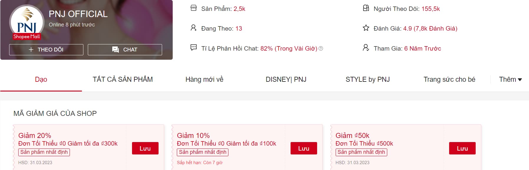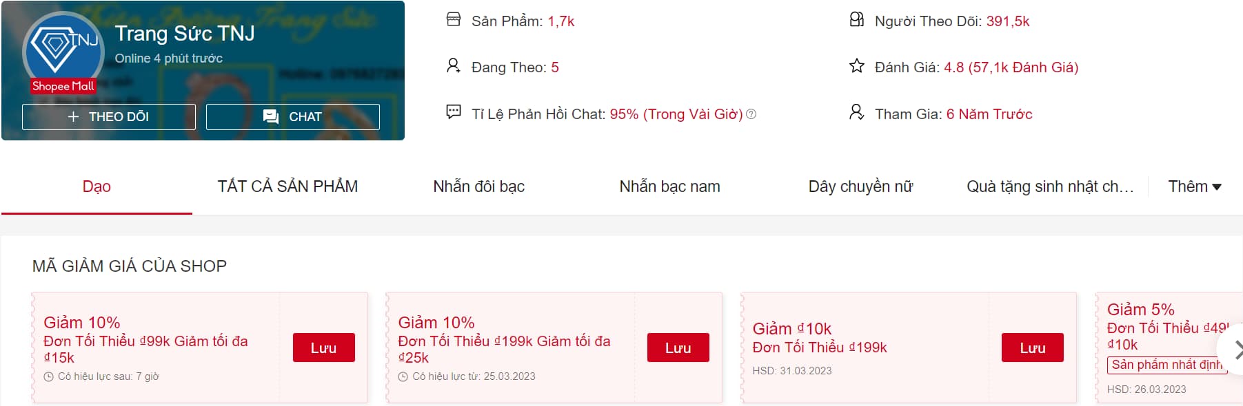 Shop Trang sức TNJ là shop chuyên bán trang sức bạc trên Shopee được nhiều người yêu thích. Sở hữu gần 400K lượt theo dõi thì mọi người cũng có thể hình dung shop bán chạy hàng như thế nào rồi. Tại đây bạn có thể tìm thấy rất nhiều sản phẩm hot như nhẫn đôi bạc, nhẫn bạc nam - nữ, dây chuyền, lắc tay, bông tai...