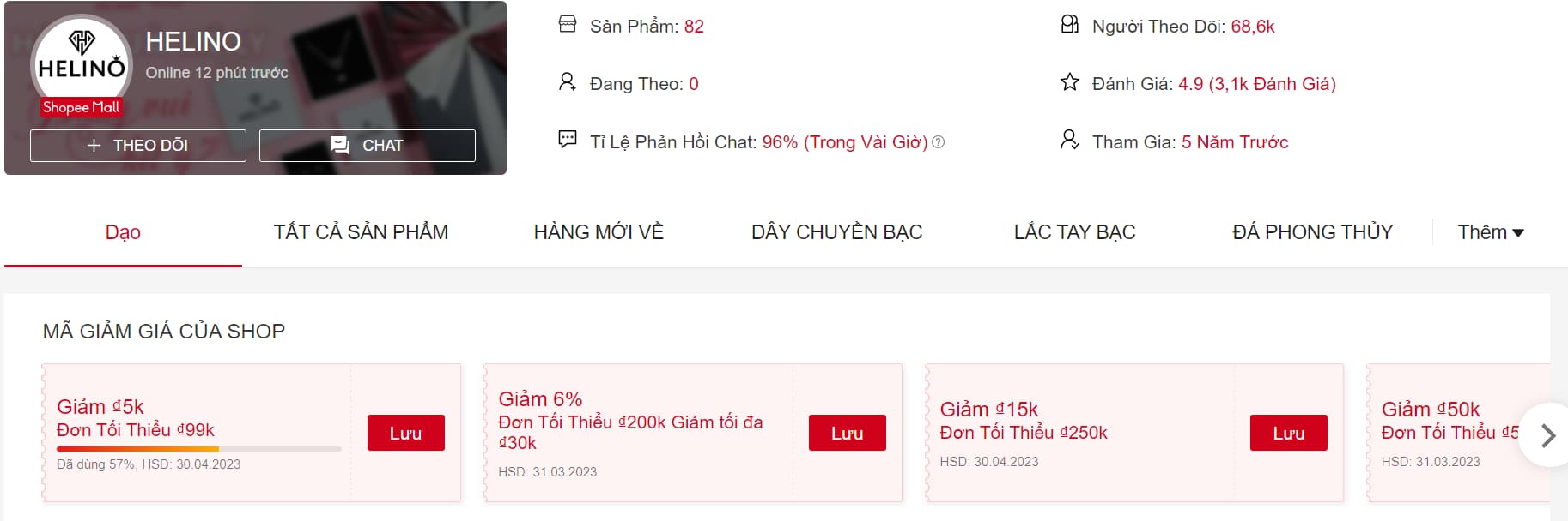 Shop HELINO là cửa hàng trang sức bạc uy tín mà ai cũng biết trên Shopee. Tại shop có khá nhiều dòng trang sức như lắc tay, nhẫn, dây chuyền, lắc chân, bông tai sang trọng, đa dạng kiểu dáng. Hơn nữa, giá thành các món đồ tại shop cũng khá rẻ, phù hợp với mọi đối tượng.