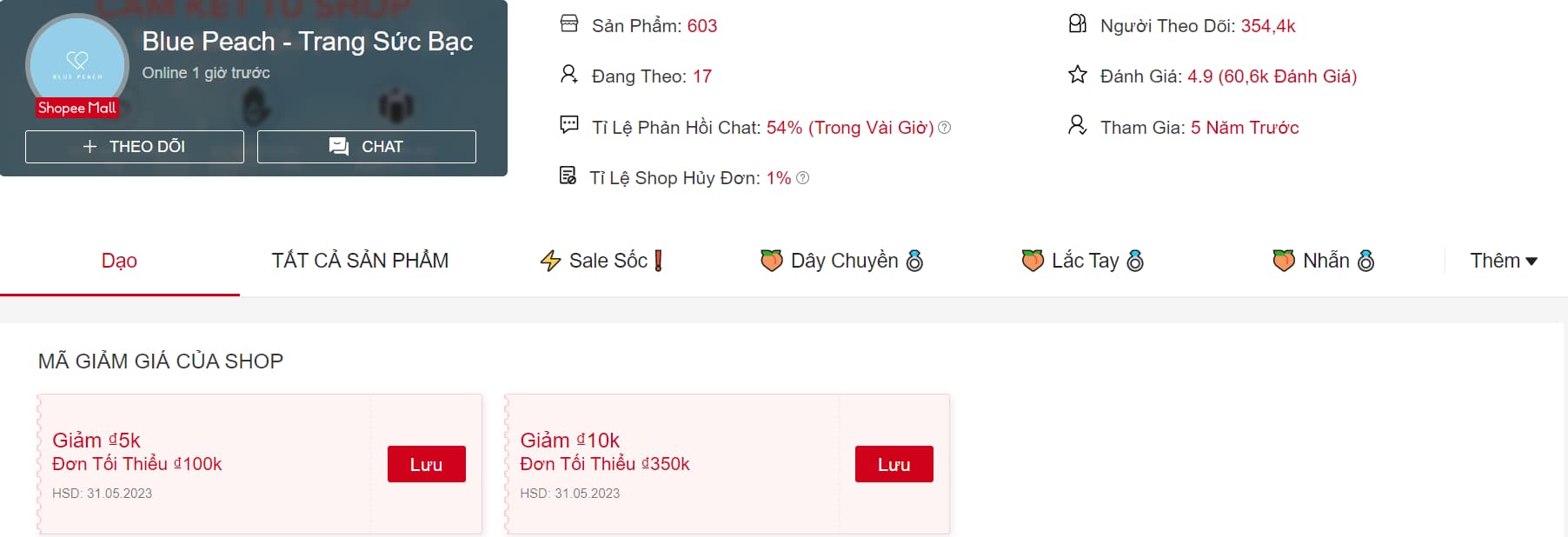 Shop Bluepeach - Trang sức bạc có rất nhiều sản phẩm nhỏ xinh và nữ tính dành cho các cô nàng. Đa phần mẫu mã trang sức ở đây cũng đa dạng, thiết kế nhỏ và tinh tế, giá cả lại hợp lý nên được nhiều bạn tin tưởng. Các sản phẩm shop bán chạy bao gồm dây chuyền bạc, lắc tay, nhẫn, bông tai, lắc chân...