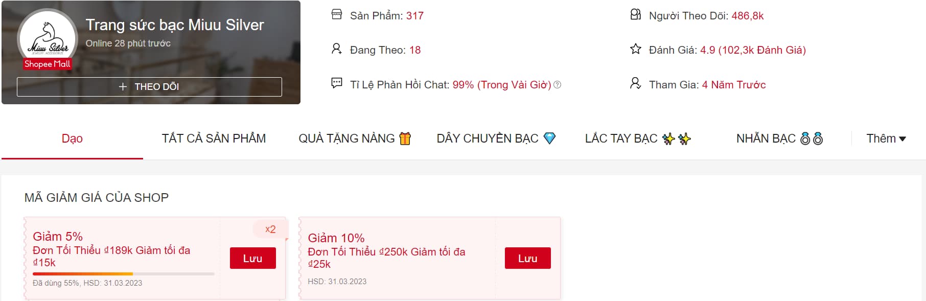 Shop Trang sức bạc Miuu Silver cũng là một trong những shop bán trang sức bạc "ngon - bổ - rẻ" trên Shopee. Tại đây bạn có thể tìm thấy những chiếc nhẫn, dây chuyền, bông tai nhỏ nhắn xinh xắn mà giá lại rất "mềm" nữa đó. Shop có gần 500K lượt theo dõi nên cũng rất uy tín, bạn có thể tin tưởng mua hàng nha.