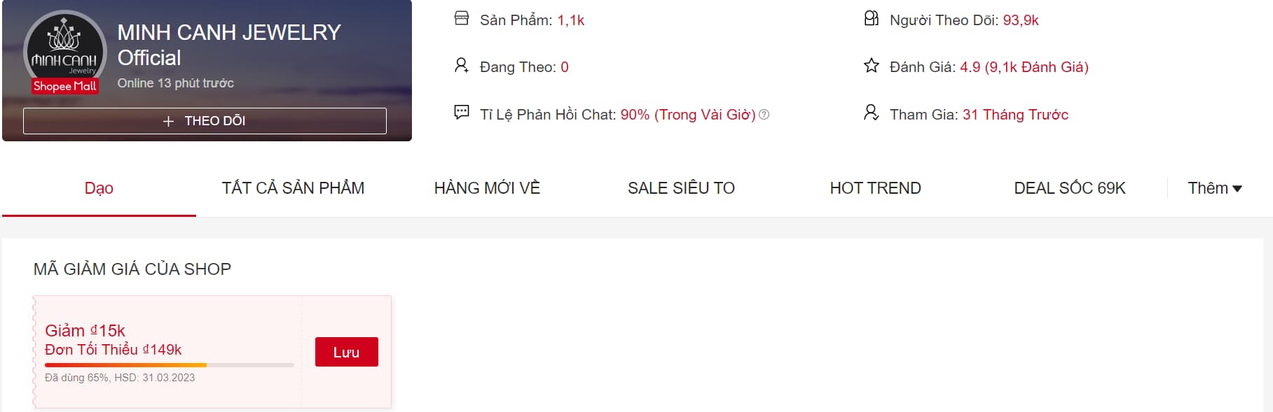 Shop MINH CANH JEWELRY Official là shop cuối cùng trong danh sách TOP 7 shop bán trang sức bạc uy tín trên Shopee mà chúng mình muốn chia sẻ tới các bạn. Các dòng sản phẩm nổi bật tại shop bao gồm nhẫn kim tiền, lắc tay bạc, bông tai, dây chuyền, lắc chân... Các bạn có thể ghé shop để xem thêm nha!