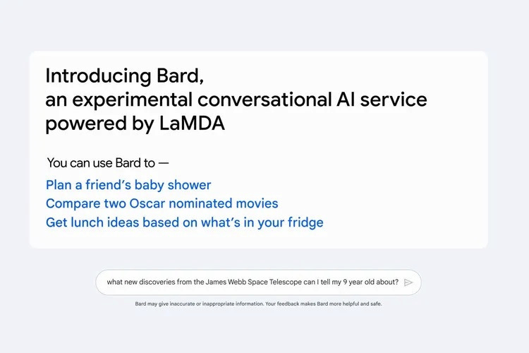 Dự án Bard được CEO Google – Ông Sundar Pichai mô tả như một “dịch vụ hội thoại AI thử nghiệm”, có khả năng trả lời các câu hỏi của người dùng và tham gia trò chuyện. Được biết, Google sẽ mở dịch vụ này cho “những người thử nghiệm đáng tin cậy” trước khi cung cấp rộng rãi cho công chúng trong một vài tuần tới.
