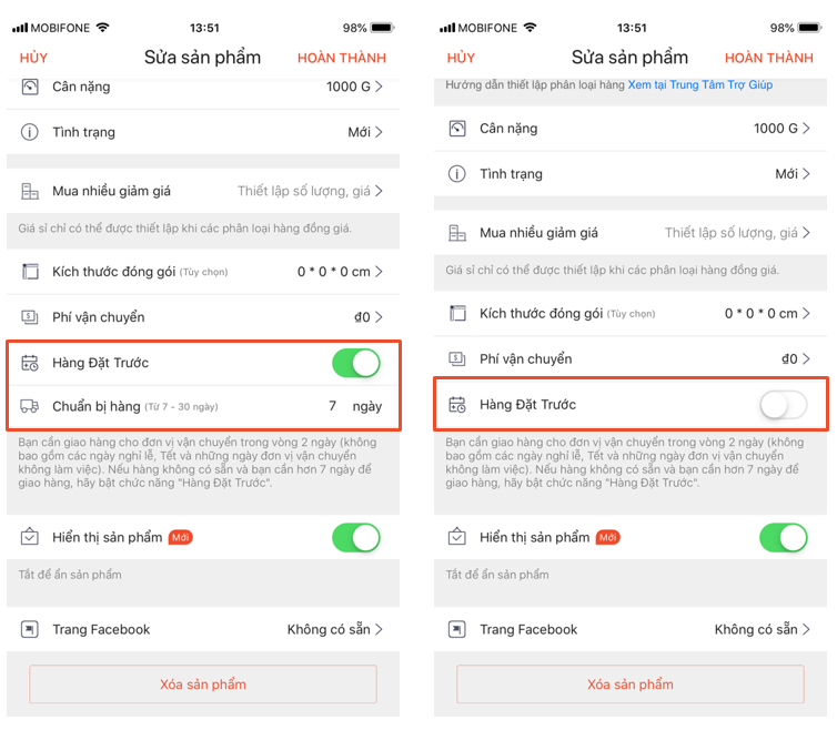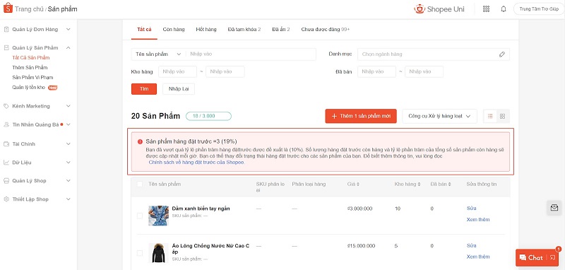 Sau khi kiểm tra xong nếu như bạn vượt quá tỷ lệ đặt hàng trước cho phép thì bạn cần thực hiện chính sửa sản phẩm theo các bước dưới đây.
