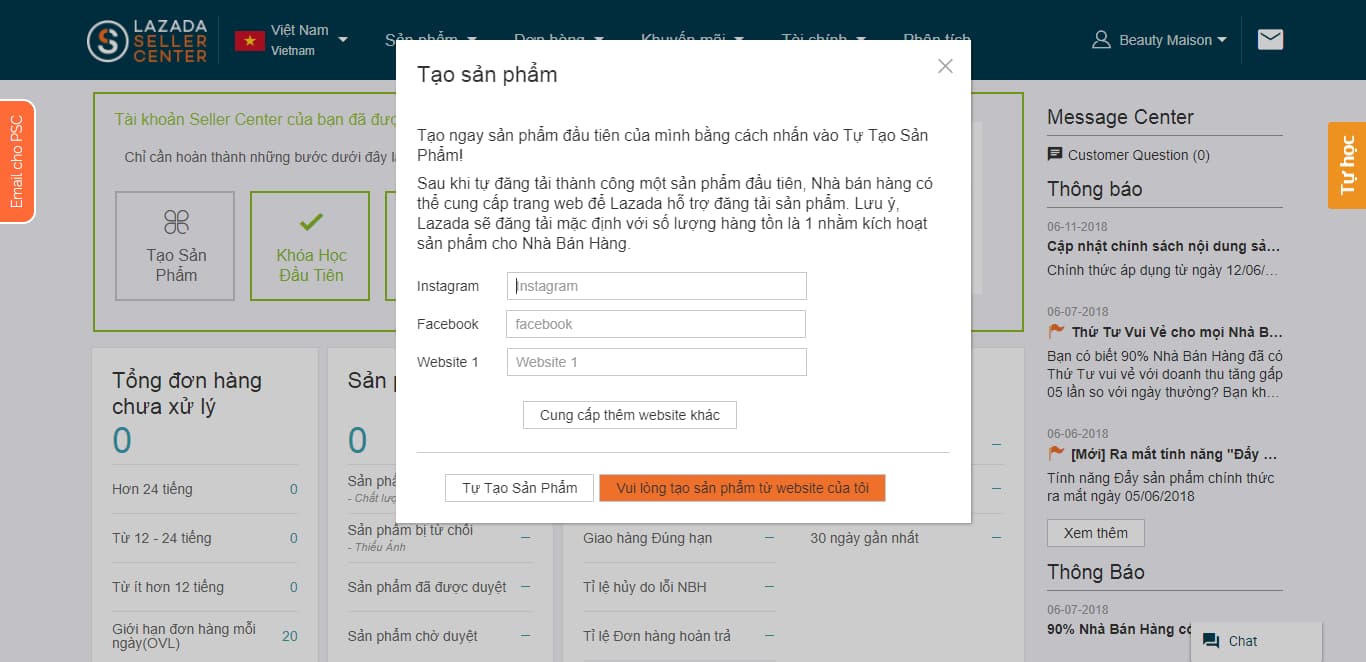 Bước 1: Truy cập trang Lazada Seller Center, click vào ô Tạo sản phẩm ở banner ngay đầu trang.