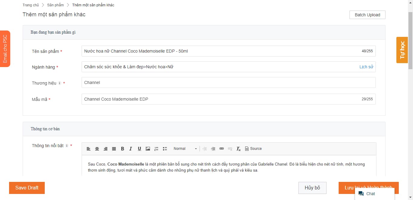 Bước 3: Điền các thông tin về sản phẩm như: Tên sản phẩm, ngành hàng, thương hiệu, mẫu mã, thông tin nổi bật, ảnh sản phẩm, khối lượng, kích thước, mã SKU, giá sản phẩm.