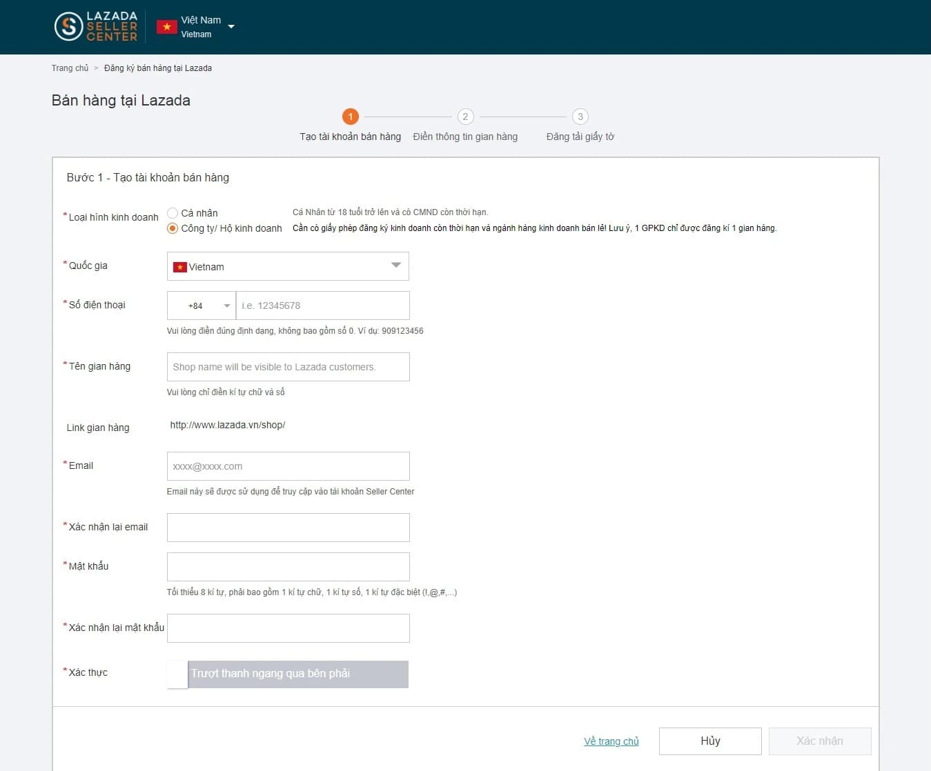 Tại đây, bạn sẽ lựa chọn loại hình kinh doanh, điền đầy đủ thông tin vào form có sẵn như: số điện thoại, tên gian hàng, Email, mật khẩu... sau đó ấn Xác nhận.