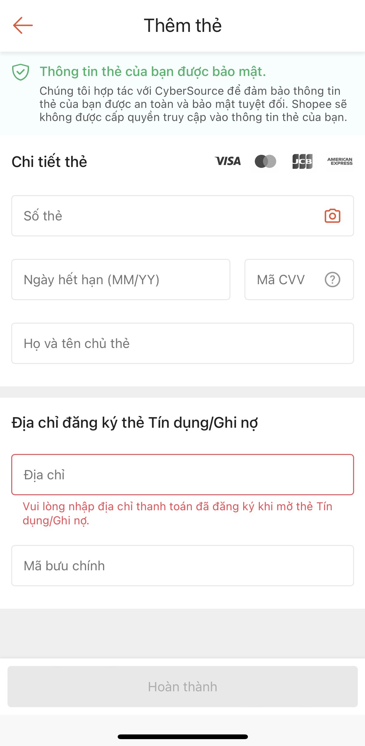 Thẻ tín dụng/ghi nợ không được chấp nhận trên Shopee: Shopee Việt Nam có thể sẽ không chấp nhận thanh toán đơn hàng bằng các loại Thẻ tín dụng/ghi nợ được phát hành tại một số quốc gia ngoài lãnh thổ Việt Nam, hoặc bởi một số ngân hàng trong nước và ngoài nước. Nên trước khi chọn hãy nhớ kiểm tra xem thẻ của mình có được chấp nhận không nhé.