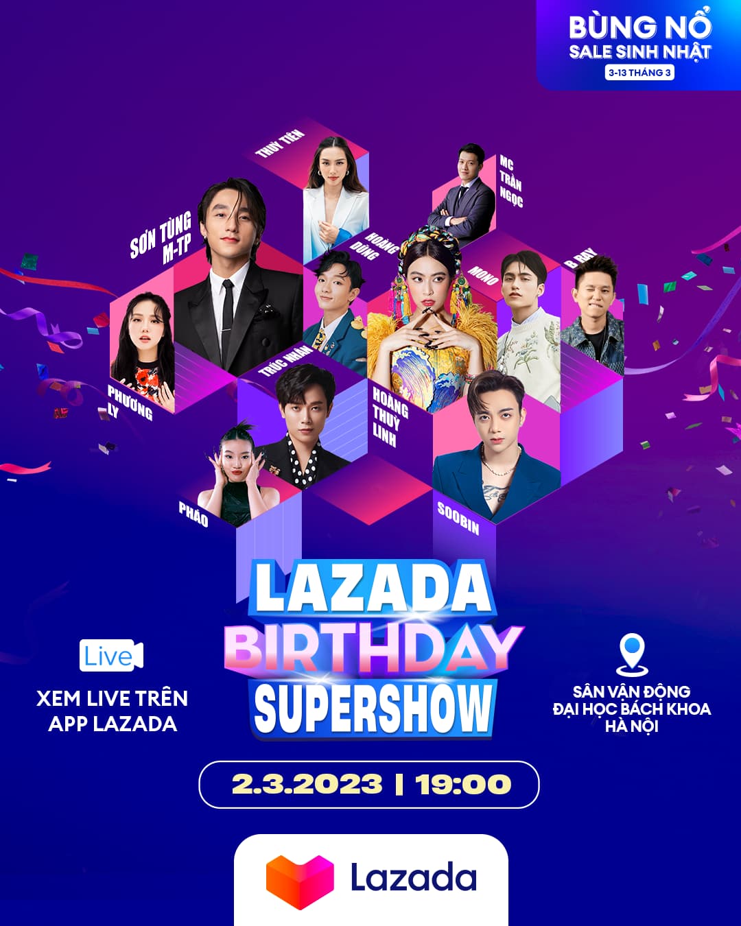 Lazada Birthday Supershow 2023 trở lại bùng nổ với sự góp mặt của dàn ca nghệ sĩ nổi tiếng hạng A, đây chính là cơ hội có một không hai để bạn gặp gỡ thần tượng của mình.