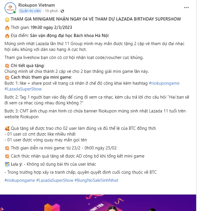 Còn chần chừ gì nữa mà không nhanh tay tham gia để có cơ hội nhận ngay vé, lên đồ và đi “quẩy” cùng thần tượng của mình nào. Đừng bỏ lỡ ánh đèn sân khấu độc đáo cùng không gian âm nhạc cực cháy tại Lazada Supershow 2023.