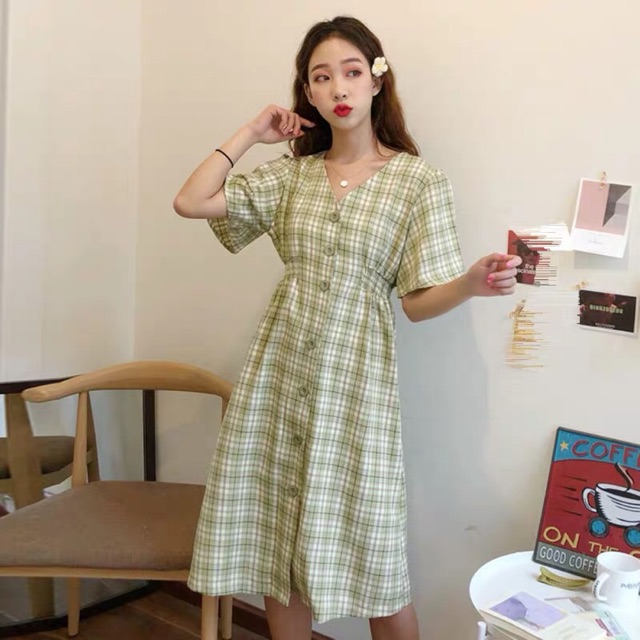 Một chút hiện hữu hương vị của xứ sở anh đào thể hiện trên chiếc váy kẻ caro đậm phong cách Mori girl. Sản phẩm thiết kế kiểu tay ngắn, dáng xòe màu xanh nhẹ nhàng.