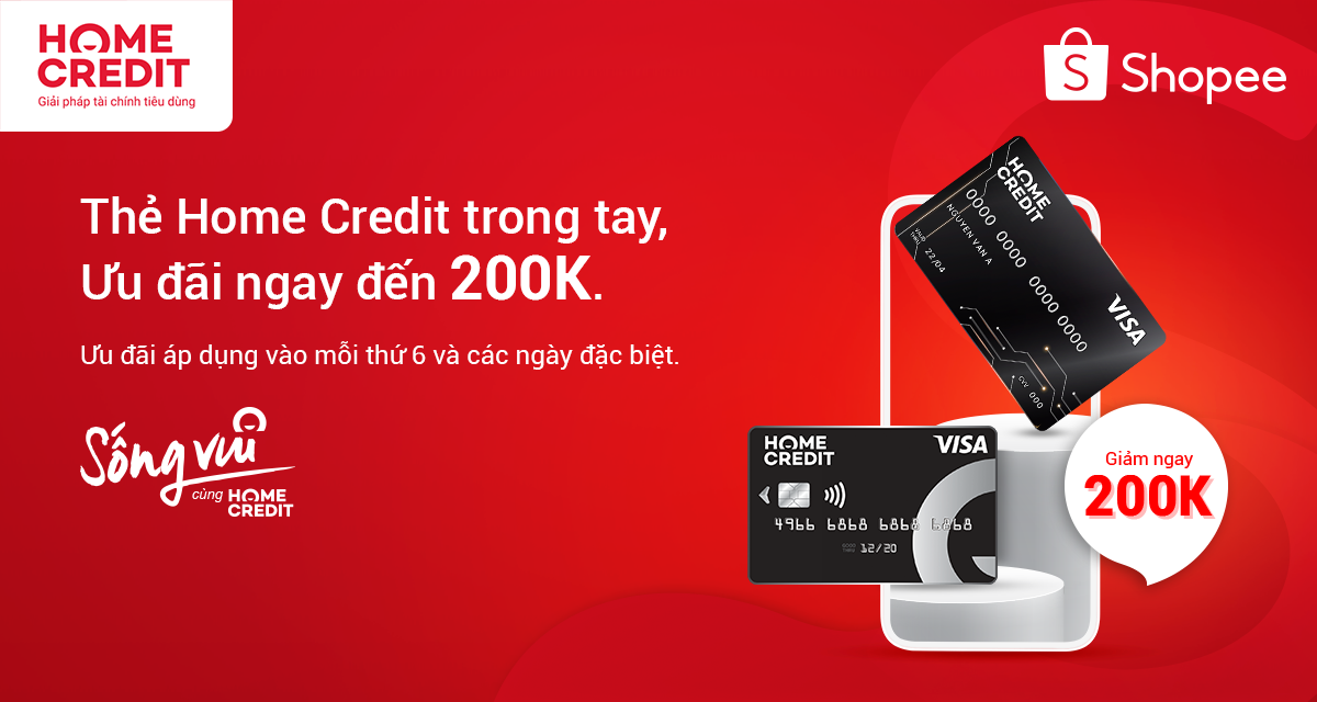 Kết hợp cùng Shopee, Home Credit ra mắt chương trình ưu đãi mua sắm “Thẻ Home Credit trong tay - Ưu đãi ngay đến 200K” áp dụng vào mỗi thứ 6 và các ngày đặc biệt khi mua hàng. Chi tiết chương trình chỉ áp dụng khi thanh toán bằng thẻ Home Credit có đầu thẻ 496616, 492236 trên Shopee gồm: