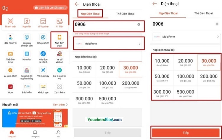 - Tiếp đến, chọn Nhà mạng di động như Mobifone, Vinaphone và nhận số tiền mà bạn muốn nạp vào.