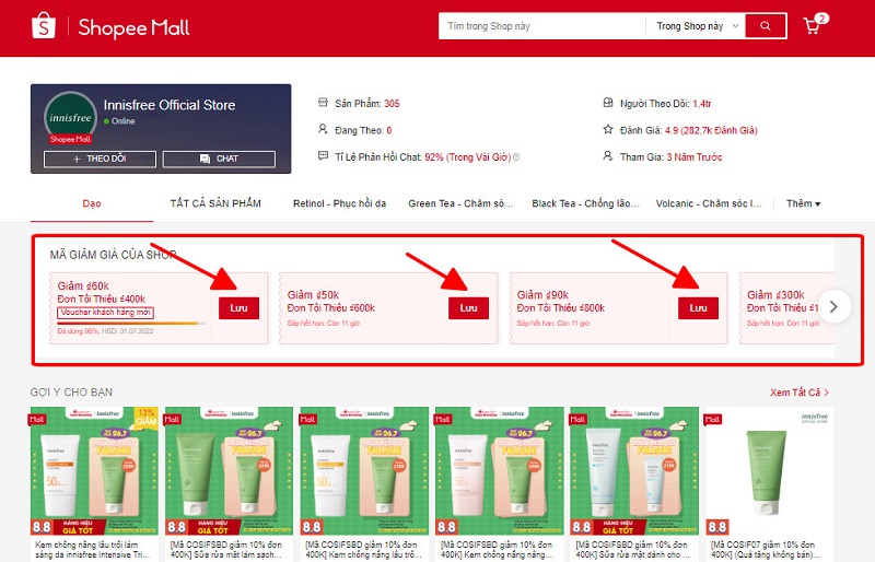- Bước 3: Ngay dưới Shop có hiện voucher của Shop, bạn nhấn “Lưu” để cho voucher sẽ bào kho voucher của bạn.