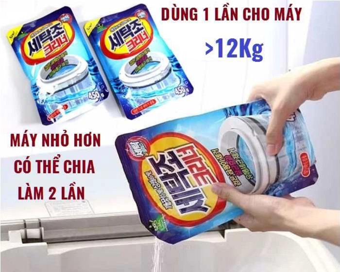 Bột vệ sinh chuyên dụng cho máy giặt sẽ loại bỏ các bụi cặn lắng và chất bẩn. Ngoài ra sản phẩm này còn có khả năng diệt khuẩn, mùi hôi trong máy giặt. Điểm nổi bật khi sử dụng bột vệ sinh chuyên dụng là không cần đến thợ tháo máy giặt, bất cứ ai có thể tự làm tại nhà, 1 gói 450gr sử dụng được cho máy giặt từ 712kg, nếu máy giặt to hơn thì dùng 2 gói.