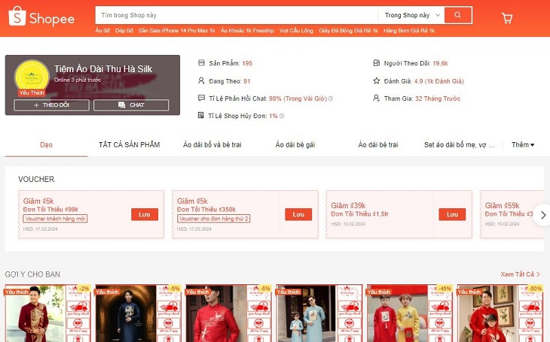 Tiệm Áo Dài Thu Hà Silk là một địa điểm khác mà người mua có thể khám phá những tinh hoa của áo dài nam giới truyền thống. Với chất liệu vải lụa cao cấp và đội ngũ nghệ nhân lành nghề, mỗi chiếc áo dài tại Tiệm Áo Dài Thu Hà Silk là một tác phẩm nghệ thuật. Sự tinh tế trong từng đường may và sự đổi mới trong kiểu dáng là điểm mạnh giúp Tiệm Áo Dài Thu Hà Silk thu hút sự quan tâm của khách hàng trên Shopee.
