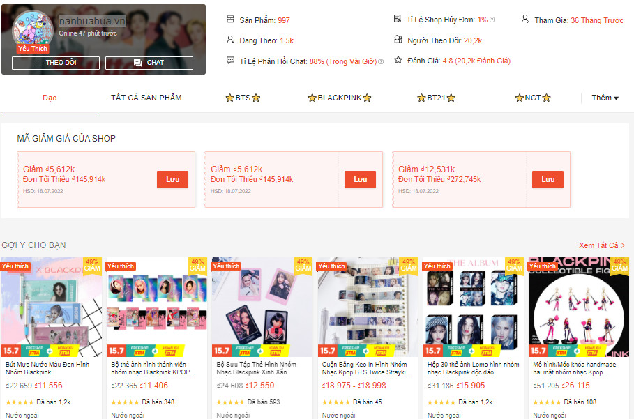 Nếu muốn mua ảnh, card thẻ, cốc hay túi in hình idol giá rẻ thì nhất định bạn phải ghé Phụ Kiện Idol 88 trên Shopee. Shop có địa chỉ kho tại Hà Nội với hơn 700 sản phẩm khác nhau khiến bạn thỏa sức lựa chọn khi ghé đây.