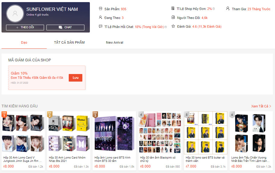 Cái tên cuối cùng trong danh sách shop bán đồ KPOP xịn trên Shopee là Sunflower Việt Nam. Đây cũng là một địa chỉ quen thuộc được nhiều bạn trẻ ghé đến mua đồ KPOP đặc biệt là đồ của BTS. Các sản phẩm như thẻ, hộp ảnh của nhóm nhạc này tại shop còn đạt tới hàng chục nghìn lượt bán đủ để thấy sức hút của shop lớn như thế nào.
