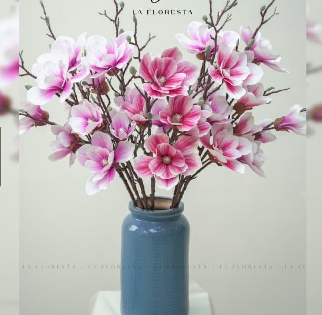 Hoa mộc lan La Floresta 3D chất liệu làm từ Silicon xuất xứ Việt Nam an toàn và đẹp như thật. Kết hợp gam màu trắng và hồng tím nhẹ nhàng quyến rũ. Kích thước 110cm, 1 bình 5 cành sẽ giúp cho không gian phòng khách của bạn sinh động, đẹp mắt hơn.