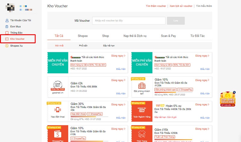 - Vào Tôi và chọn Kho Voucher. Sau đó bạn có thể tìm mã giảm giá mới nhất, mã giảm giá phổ biến hoặc mã giảm giá sắp hết hạn một cách đơn giản.