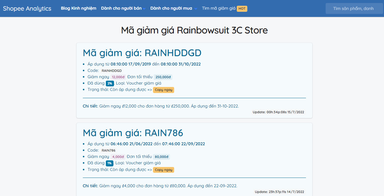 Bước 1: Truy cập danh sách Mã giảm giá Rainbowsuit 3C Store trên Shopee Analytics