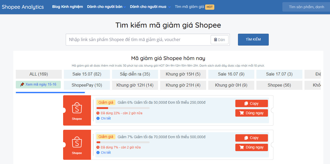 Truy cập trang tìm kiếm mã giảm giá của Shopee Analytics tại: https://www.shopeeanalytics.com/vn/ma-giam-gia.html.