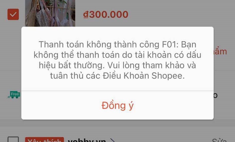 Lỗi F01 Shopee sẽ được cảnh báo như sau: “Thanh toán không thành công F01: Bạn không thể thanh toán do tài khoản có dấu hiệu bất thường. Vui lòng tham khảo và tuân thủ các Điều Khoản Shopee”.