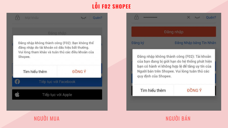 Khi bạn vi phạm chính sách của Shopee để gian lận từ đó chuộc lợi từ các khuyến mãi ở đơn hàng 0Đ, mã dành cho khách hàng mới liên kết tài khoản với Shopee pay hoặc các mã miễn phí vận chuyển 0Đ. Lỗi sẽ được thông báo như sau “Đăng nhập không thành công (F02): Bạn không thể đăng nhập do tài khoản có dấu hiệu bất thường. Vui lòng tuân thủ các điều khoản của Shopee.”