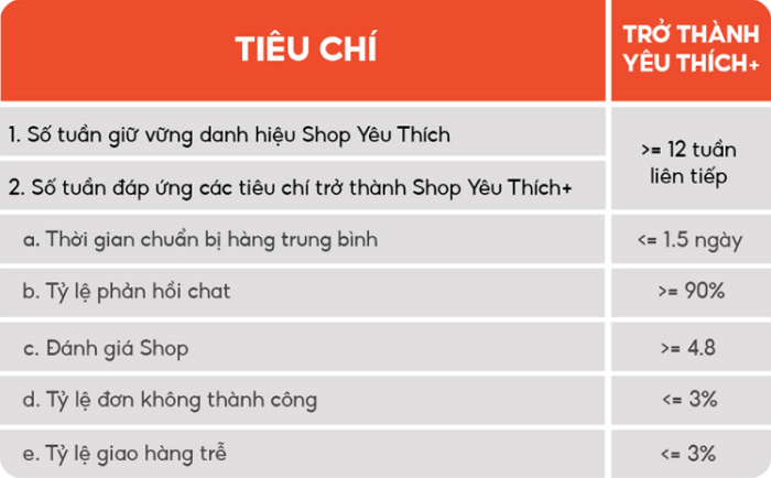 Sau đây sẽ là các thông số mà shop cần đạt được để có thể trở thành Shop yêu thích+: